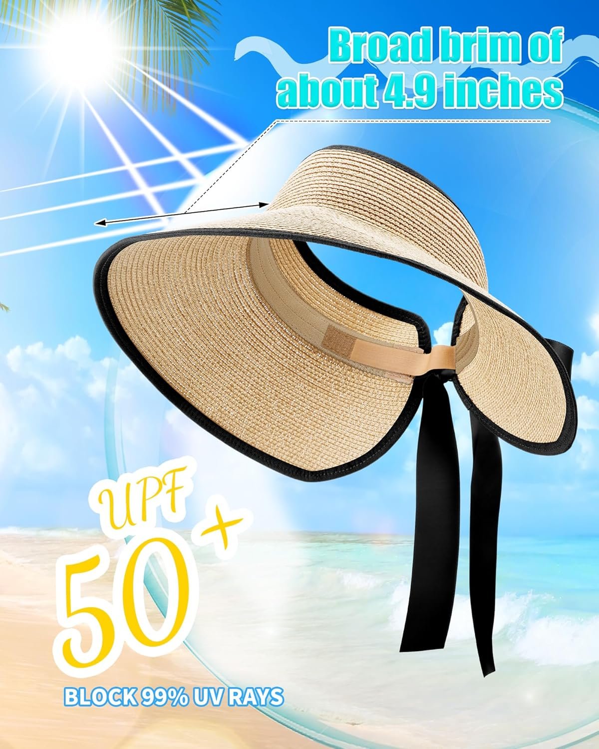 - Packing List: with our package, you get 3 differently colored sun beach hats; Designed with a broad brim of about 4.9 inches, our hats provide sun protection without compromising your vision or conflicting with your shoulders; The hat pack also comes in a sufficient quantity to meet your needs for replacements or as gifts